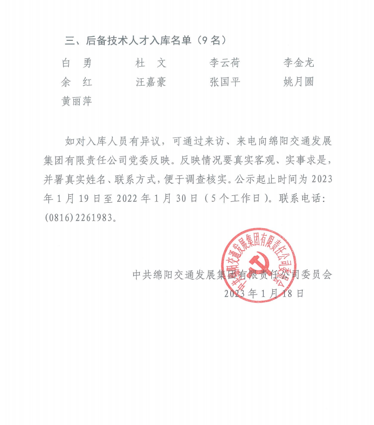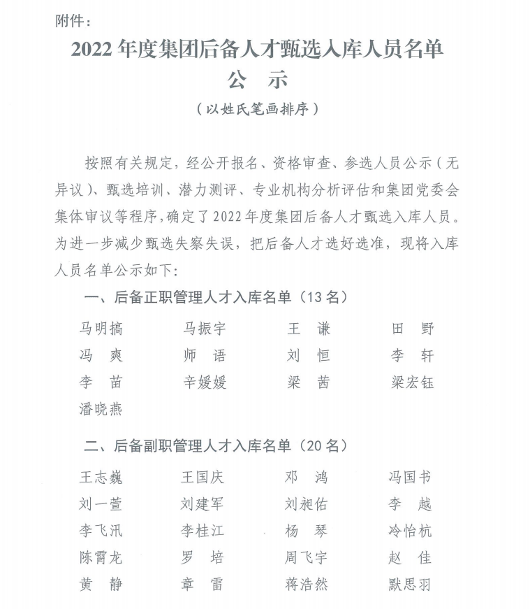 中共綿陽交通發(fā)展集團有限責任公司委員會關于印發(fā)《2022年度集團后備人才甄選人庫人員名單公示》的通知